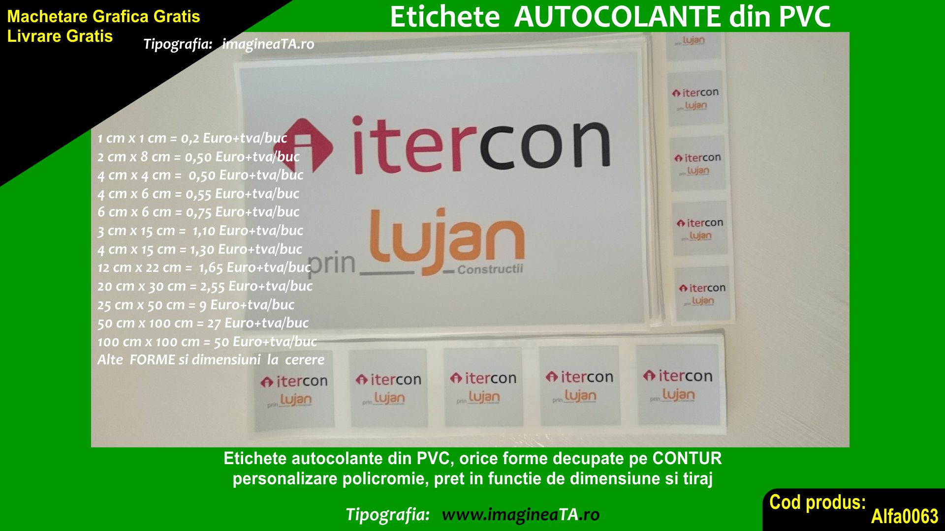Realizam etichete autocolante diverse dimensiuni, formate, tiraje. Mai puteti vizualiza si pagina cu Stickere din material PVC, rezistente la apa, care completeaza aceasta pagina de autocolante.