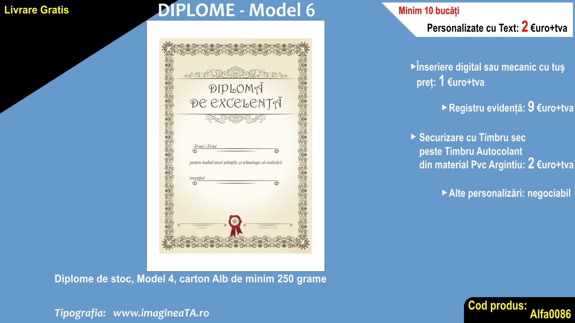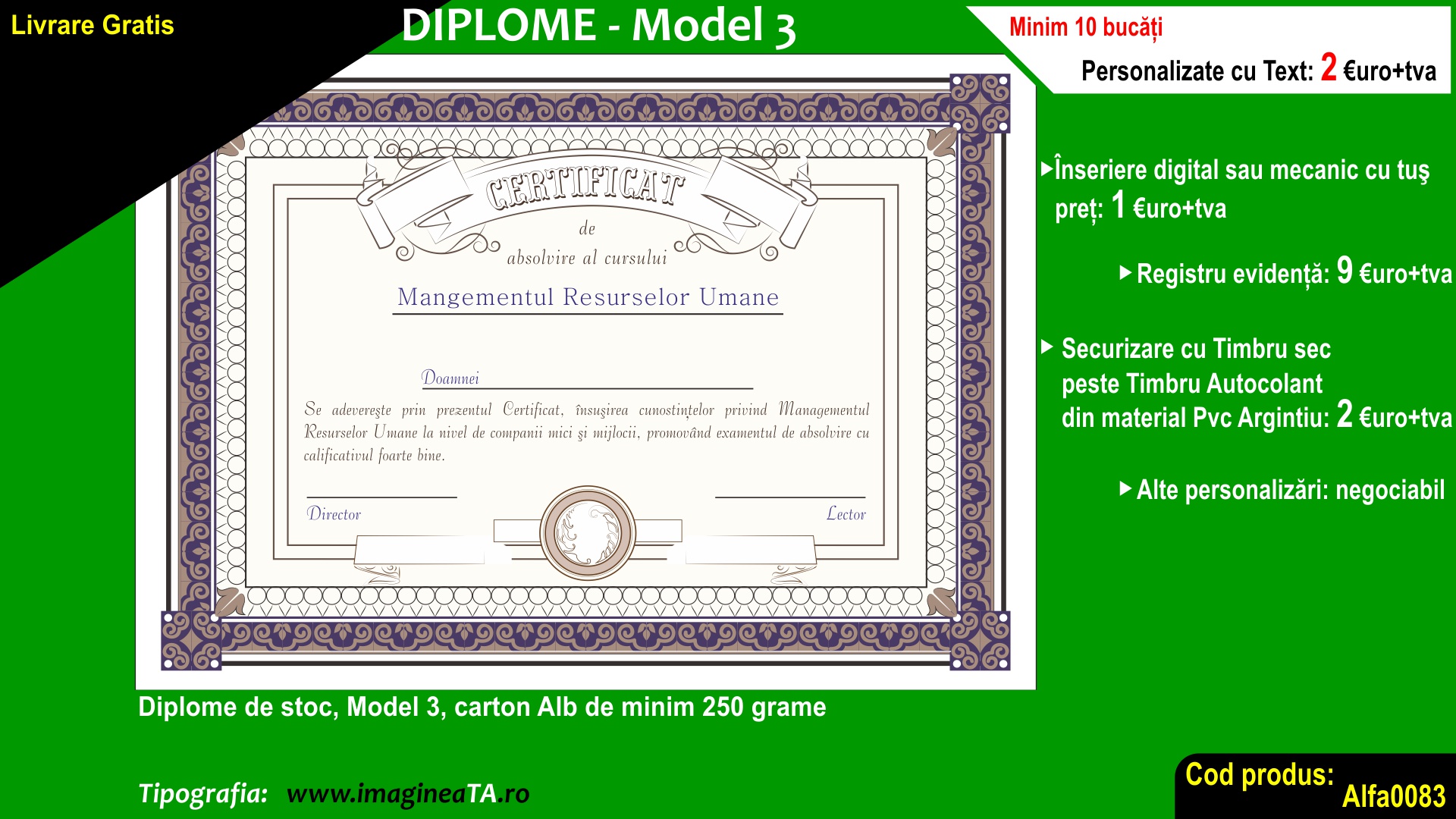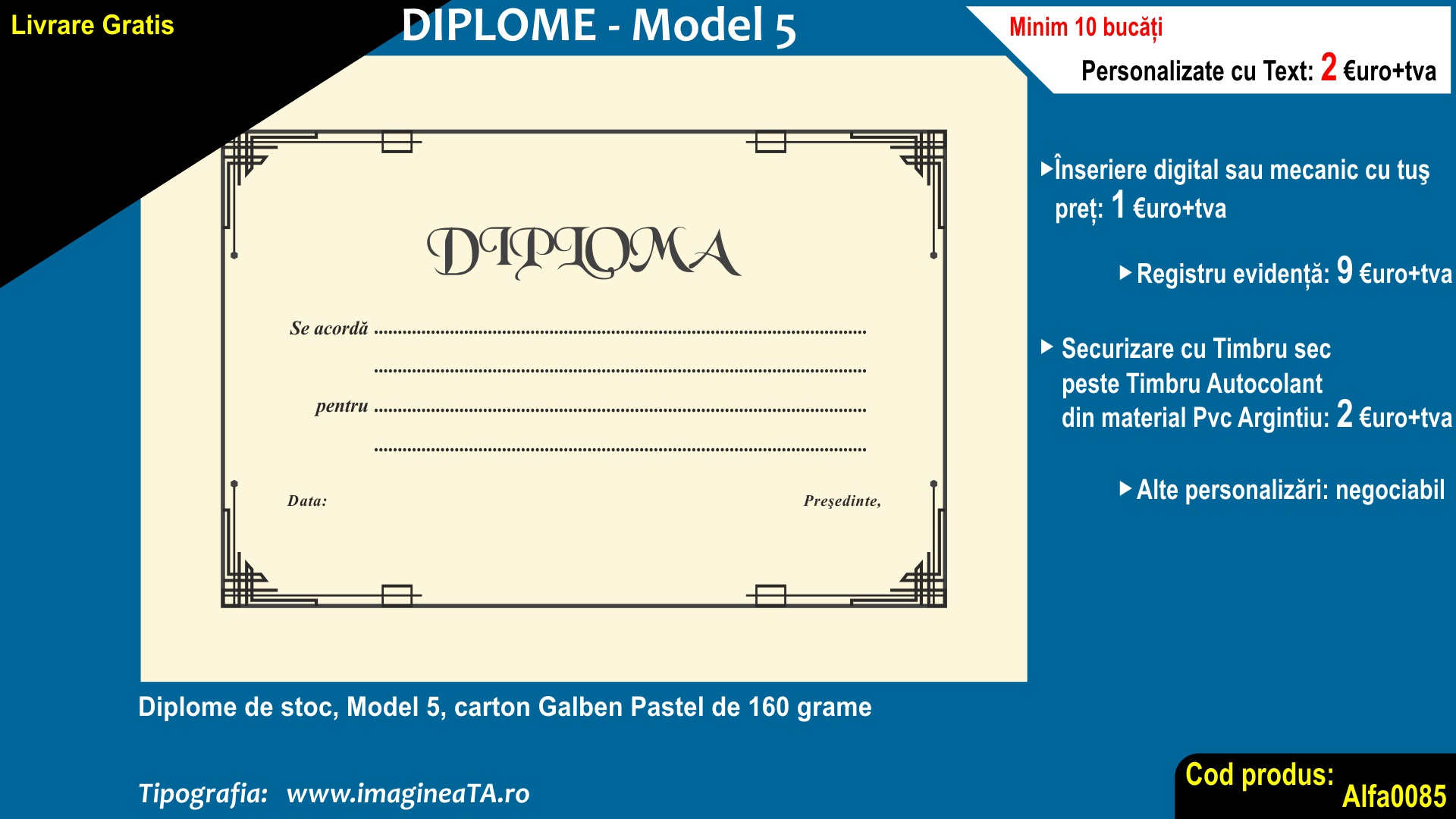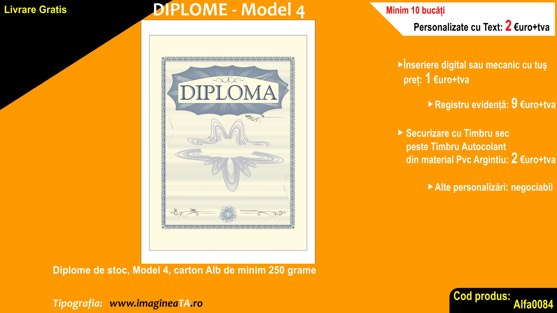 Realizam diplome, certificate, atestate in productie proprie, cu grafica personalizata sau de stoc conform modelelor existente in portofoliul nostru de modele diplome.