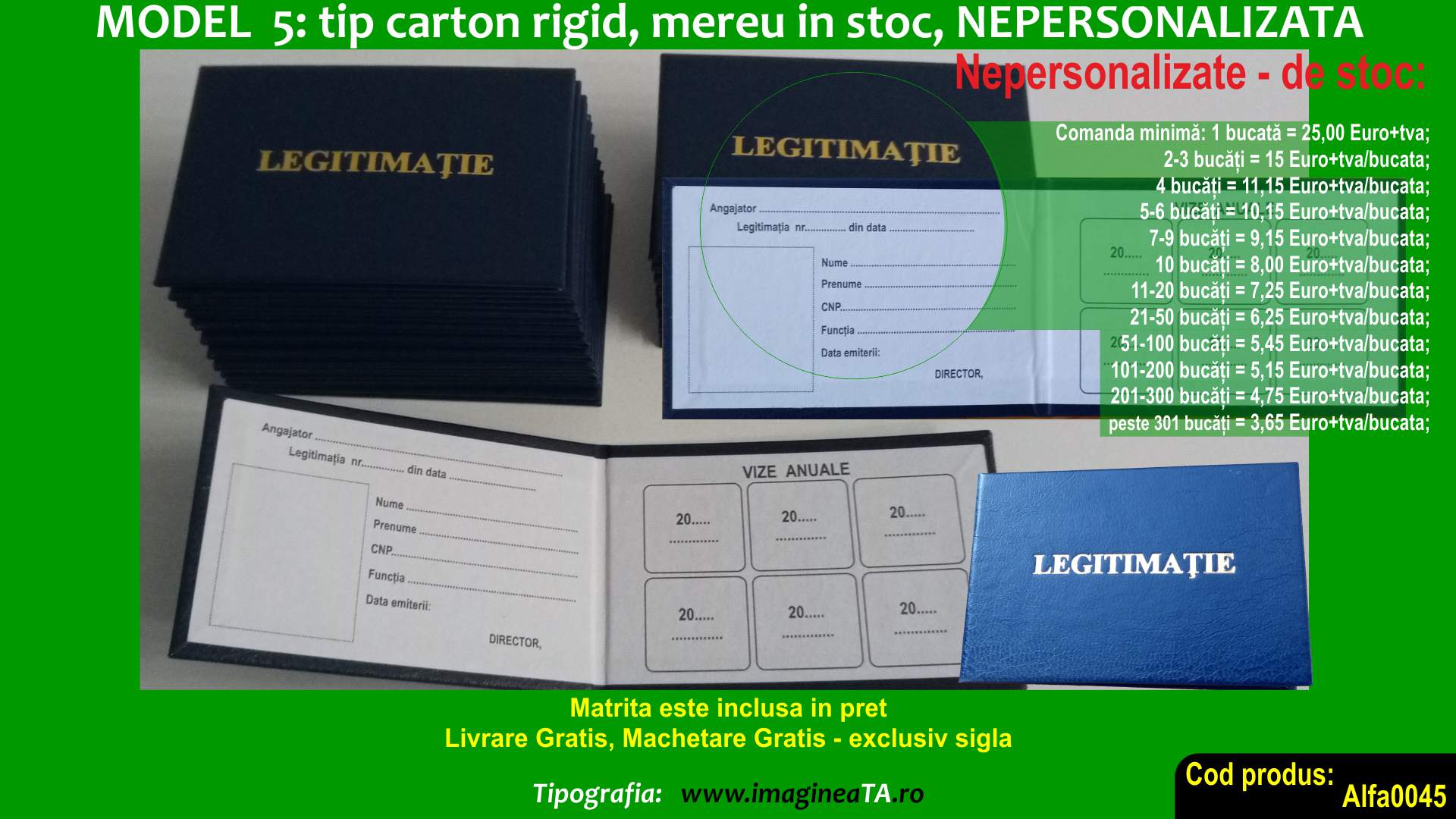 Cel mai ieftin model si reprezinta doar Legitimatia in sine din carton subtire de 250 grame personalizata fata+verso, accesoriile le puteti achizitiona separat in functie de preferinte.