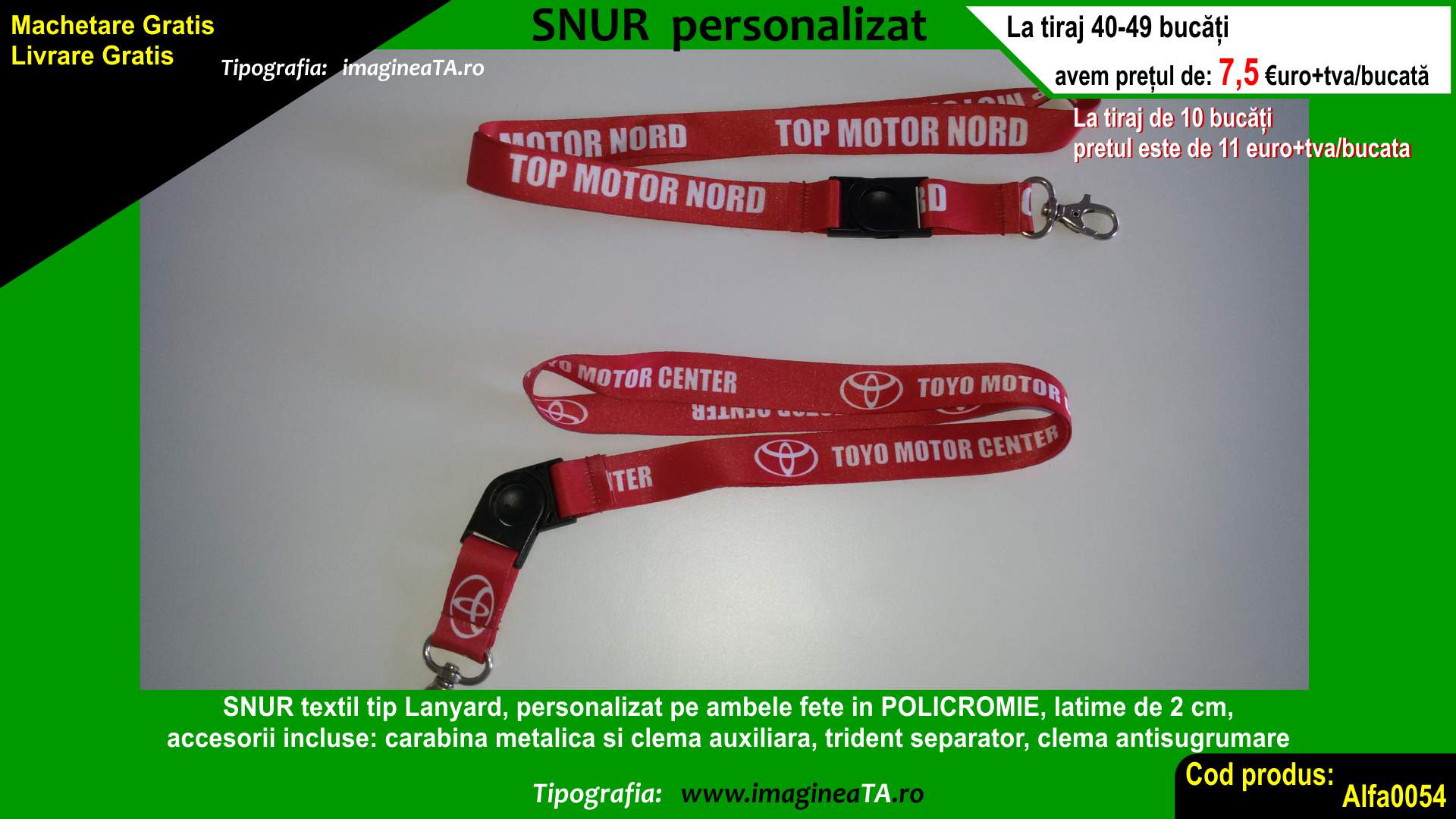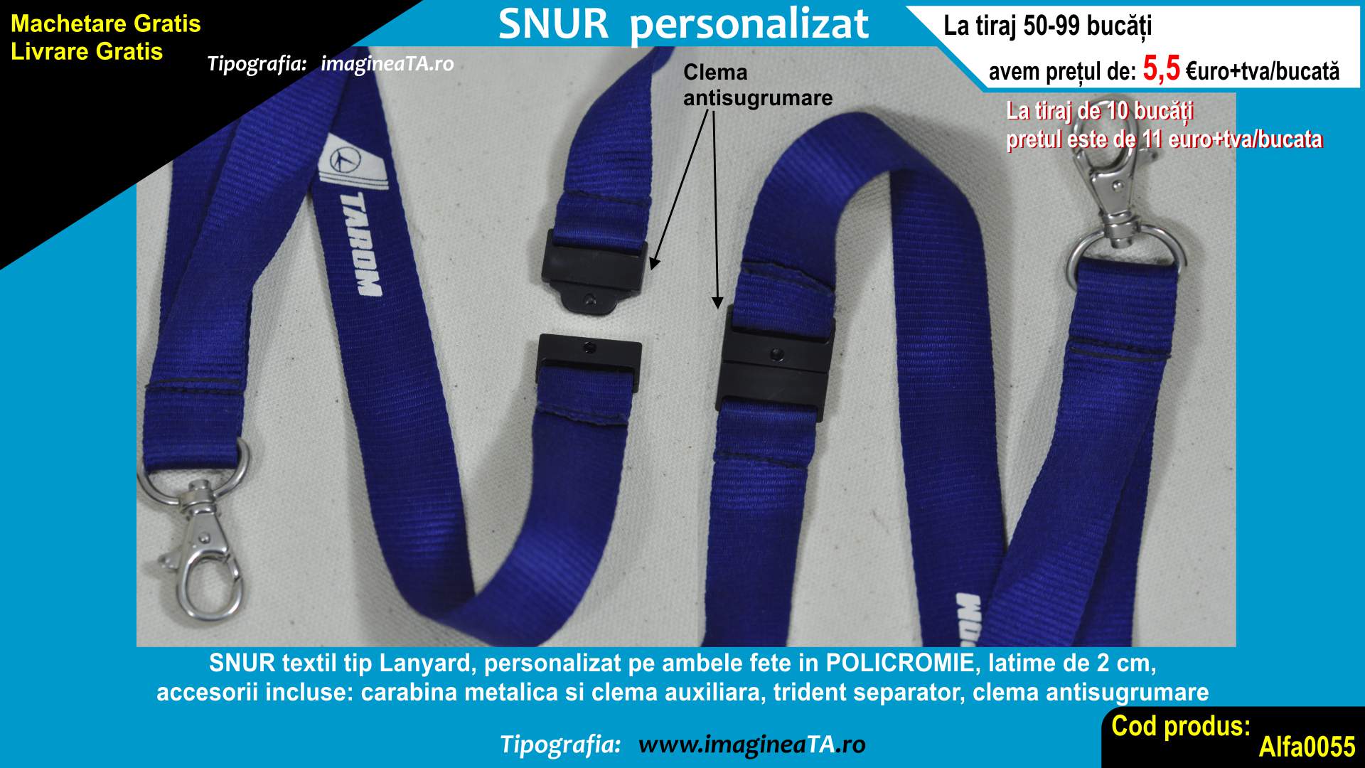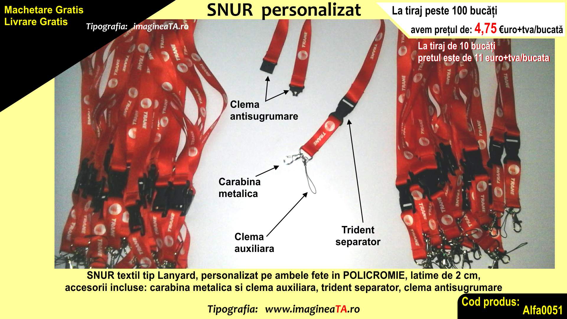 Snur textil tip Lanyard, personalizat pe ambele fete in policromie, latime de 2 cm, accesorii incluse carabina metalica, clema auxiliara, trident separator si clema antisugrumare